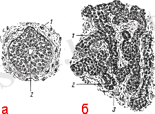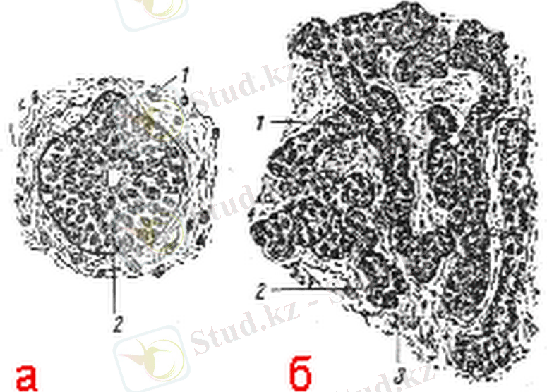 Сурет 2. Қалқанша безінің бастамалары. 1 - эпителиальды тәж, 2 - фолликула бастамасы, 3- мезенхима
