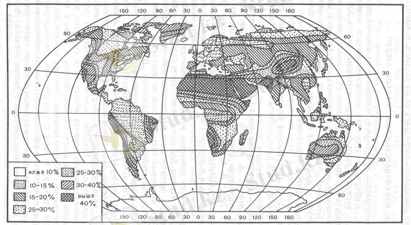 Жауындардың жер бетінде таралуы негізінен атмосфера циркуляциясына, рельефқа бағынышты. Орташа есеппен жауынның жер шарында таралуы 1-ші суретте көрсетілген (сурет 1) .