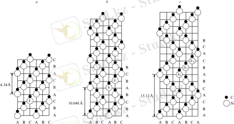 1-сурет. Кремний мен көміртек атомдарының жазықтықтағы позициялары (1120) . 7 a-3C-SiC, b-2H-SiC, c-6H-SiС