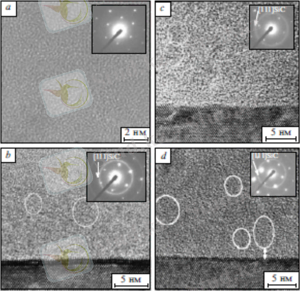 T, 0 C: 200(a), 300(b), 400(c), 600(d) . Қойғыштарда микроэлектрограммалар көрсетілген, шағылған күйдегі нанокристалиттер қоршалған.