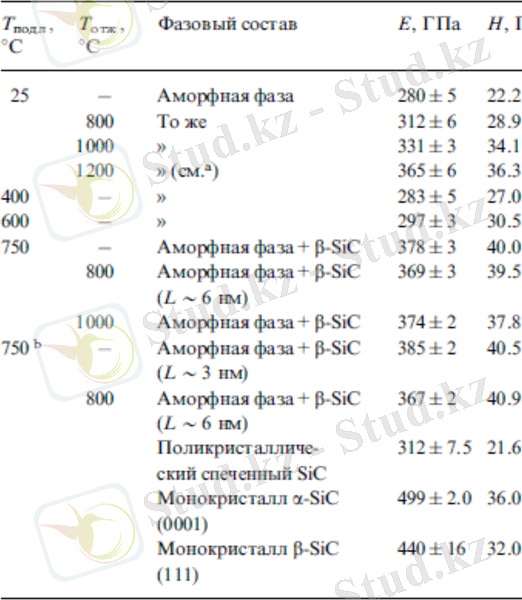 Магнетронды тұндырудың температура әсері мен жанудан кейінгі қалыңдығы 3, 2-4, 4 мкм SiC қабыршақтарының қасиеттері н сипаттайды, олар табл. 5 пен 9-суретте көрсетілген. Салыстыру үшін табл. 5-те SiC үлгісінің пісірілген және монокристалдық қасиеттері көрсетілген.