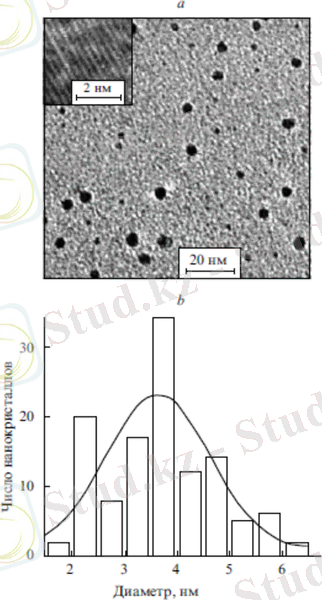 Электрохимиялық анодты жеміру HF-EtOH (1:1) ерітіндісінде ток тығыздығы 210 мА см -2 болғанда 25 минут ішінде пайда болады; кеуекті қабаттың (қалыңдығы ~ 100мкм ) төсеніштен бөлу үшін ток аз уақытқа 1А см -2 ұлғаяды. Сонымен қатар, кәдімгі 3C-SiC ұнтақтарының дезинтеграциясының 100 0 С-да 1 сағатта HNO 3 -HF(1:3) ерітіндісінде химиялық жеміру жолымен ортафигураланады, жуылады және кептіріледі. SiC нанобөлшегінің электро-микроскоптық кескіні, гистограмма және оның өлшем бойынша орналасуы, бір бөлшектің микрофотографиясы 3-суретте көрсетілген. Алынған бөлшектер дөңгелек формада және өлшемдері бойынша бірдей болады (орташа өлшемі 3, 75нм) .
