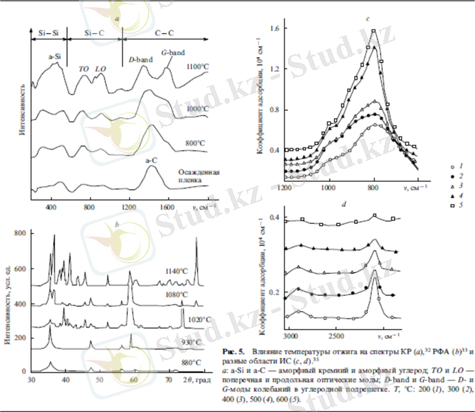 SiC қабырқшаларының КР, РФА және ИС спектрлерінің температуралық эволюциясы аргон мен сутекті-аргон плазмасындағы реактивті магнетронды синтез, газдық ерітіндісі силан, метан және сутектегі молибденді сымды CVD әдістерімен алынған мысалдар 5-суретте көрсетілген.