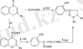 Бұны флавонның гидразин және оның туындыларымен реакциясынан байқауға болады. Егер қышқыл және бейтарап ортада флавон гидразоны түзілсе, әлсіз сілтілік ортада 2-оксихалкон гидразоны түзіледі, ал күшті сілтілік ортада пиразолин туындыларына циклденеді [20] :