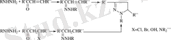 1, 3-, 1, 4- немесе 1, 5-Дикарбонильді қосылыстар гидразиндермен әрекеттескенде: а) полимер, б) екі молекула гидразин және екі молекула дикарбонильді қосылысы бар циклды қосылыс не в) бір молекула гидразин және бір молекула дикарбонильді қосылыстан тұратын циклды қосылыс түзіледі. Орынбасқан гидразиндерден моногидразондар, дигидразондар, ал кей жағдайда гетероциклды қосылыстар да түзіледі: