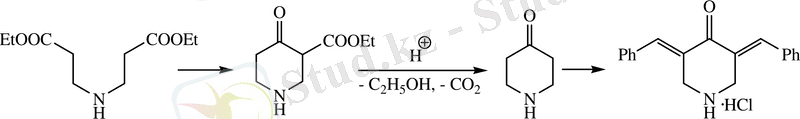 Шыққан өнімді сабындалу және 20 %-ті тұз қышқылымен декарбоксилдеу жүргізген және норпиперидон-4 айналдырылған, ол кезегінде өздігінен конденсацияға бейм болғандықтан, тез шайырланып кетеді. Нәтижесінде γ-пиперидон 3, 5-дибензилиденпиперидин-4-он гидрохлориді түрінде бөлініп алынған.