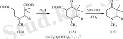 Жұмыста [10] аталып өткендей амидоэфирлердің (1. 4) циклденуі натрий гидриді мен құрғақ бензол суспензиясында азот атмосферасында 4 сағат қыздырғанда 5-карбэтокси-1, 3, 3-триметил-2-( м , м , п -триметоксифенил) -γ-пиперидонға (1. 5) алып келеді. Соңғыны декарбоксилдеу жүргізгенденде 1, 3, 3-триметил-2-( м , м , п -триметоксифенил) -γ-пиперидон (1. 6) алуға мүмкіндік береді.