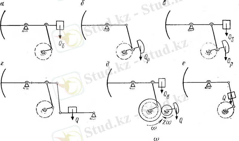 Сурет 2. Екіиінді балансирлік тербелмелі станоктардың механикалық теңгеру әдістері: а - балансирлі теңгеру; б - кривошипті (роторлық) теңгеру; в - құрамдастырылған теңгерім, г - өтірік тербелменің көмегімен теңгеру; д - екі еселенген жиілікпен айналатын противовестің көмегімен теңгеру; е - шатундық теңгерім