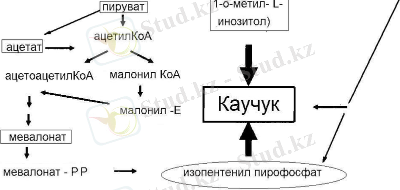 Пирофосфатмевалонат ең негізгі изопреноид метаболизмінің реакциясына қатысады. Ол изопентилпирофосфат пайда болуы. Терпендердің, сесквитерпендердің және жоғарғы изопреноидтардың түзілуі цис-1, 4- көмегімен изопентилпирофосфат қалдығының ұзарған изопреноид тізбегіне қосылуы нәтижесінде пайда болады. Бұндай полимеризация әдісі изопреноид синтезінің негізі болып табылады, соның ішінде каучуктың да. (сурет 1)