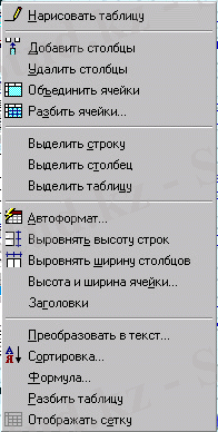 1 - сурет. "Таблица" тобының пункттар менюi