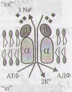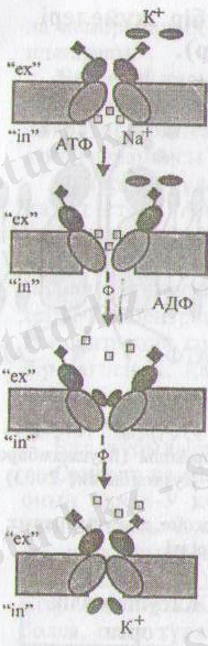 1) Nа + , К*-сорғышы немесе Иа + , К + -т2уелді АТФ-аза-2а -ширатпадан, 2р-құрылымнан түратын интегралдық ақуыз. Ол АТФ энергиясын пайдаланып № + және К + иондарын олардың концентрация градиентіне қарсы бағытқа өткізеді, яғни № + ионын-жасушадан сыртқа, ал К + ионын-жасуша ішіне.