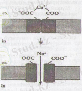 Nа + арналарының ашылуы сыртқы ортадағы Са 2 + ионының концентрациясына тікелей байданысты болады. Егер сыртқы ортада Са 2 + ионы концентрациясы жоғары болса, онда Ыа + арналары өздерінің карбокситоптарымен (СОО-) Са 2 + ионымен байланысады, ал Са 2 + иондары арнаның ашылуына кедергі келтіреді (97-сурет) . Нәтижесінде Са 2 + ионы мембрананың қозуын төмендетеді.