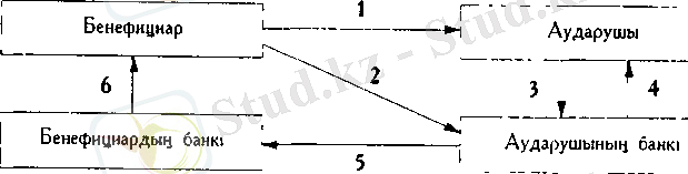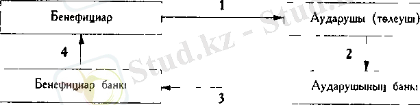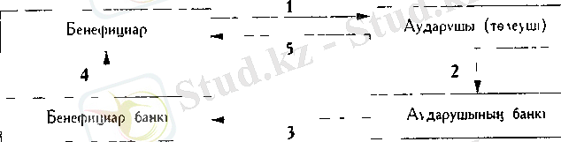 1 - тауарды (қызметті) жабдықтау, 2 - төлем тапсырмасын банкке беру және шоттан қаражатты шегеру, 3 - бенефициар банкіне қаражатты аудару және алушының шотына есептеу, 4 - бенефициардың шотына қаражат түскендігін хабарлау