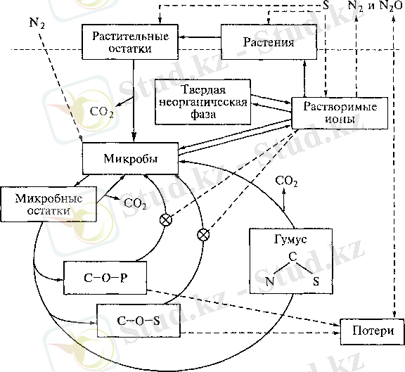 Орман экожүйелеріндегі азоттың, күкірттің және фосфордың биогеохимиялық циклдері тек бір-бірімен ғана емес, сонымен бірге көміртек айналымымен тығыз байланысты екені белгілі (14 тарауды қара) . С:N қатынасын топырақтағы азоттың микробты минерализация және иммобилизация барыстарын болжамдау биогеохимиялық үлгілері үшін кеңінен қолданады (рис. 16. 7) .