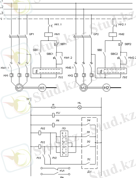 ... жалғасыПринципиалды электрлік сұлбада екі сораппен Н1 және Н2 кезекші бөлемсіз басқару схемасы қарастырылған. Бақыланатын резервуардағы сұйық деңгейіне байланысты сораптар тоқтатылады немесе іске қосылады. Сұйықтықты бактiң толтыруын бақылау үшiн ДУ электрондық деңгей датчигі қолданылады. Сораптың қосылуы немесе тоқтатылуы құбырөткізгіштің шығысындағы ашық ысырмаларға байланысты. Екі сорап арасынан біреуі жұмысшы, екіншісі резервті. Жұмыс режимі екі жағдай бойынша қосып айырғыш бойынша жұмыс істеледі: бірінші жағдай сорап Н1 электроқозғалтқышпен М1 жұмысшы сорап Н2 электроқозғалтқыш М2 резервті; екінші жағдайда егер Н1 сораптың М1 электроқолтқыштың өнімділігі төмендесе онда Н2 электроқозғалтқыш М2 жұмысшы болып келеді. Бірінші жағдай бойынша жұмысты талдайық: А - сораптармен автоматты басқару режимі қосылған, 1, 3 контактілері РУ1 және РУ2 түйіспелерін тұйықтайды бірақ реле іске келген жоқ, қалыпты сұйық деңгейінде Э2 және Э3 деңгей өлшегіштің электродтары ажыратылады. Сұйық деңгейі Э3 электродына жеткенде РУ1 реле түйіспе тұйықталады және КМ1 магниттік бергішін қоректендіреді. М1 қозғалтқыш қосылады және Н1 сорап су тарта бастайды. Бактағы су деңгейі төмеңдейді, бірақ су деңгейі Э2 ден өткенде сорап жұмыс істей береді және РУ1 өзінің түйіспелері арқылы тоқпен қамтамасызанады. Бактағы су деңгейі қалыпты деңгейден түскеннен кейін Э1 контактісі ажыратылады. Бұл блокировка сораптың қалыпты жұмысы үшін қажетті болып келеді.