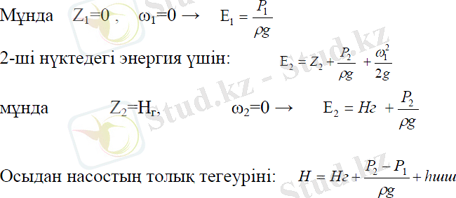 Сұйықты геометриялық Н г биіктікке көтеру үшін, жоғарғы және төменгі ыдыстардағы қысымдар айырмасы мен құбырлардағы толық гидравликалық кедергіні жеңуге жұмсалады. Егер жоғарғы және төменгі ыдыстардағы қысымдар Р 1 =Р 2 бірдей болса, Н = Н г + h ш . Егер сұйық горизонталь құбырмен берілсе,