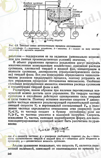 Автоматтандырудың үлгі шешімі. Тұндыру процесінің автоматтандырылуының негізгі басқару қағидасын жонғыш (қырғыш) құрылығысының тұну мысалымен қарастырамыз (4. 8 сурет) . Тұндыру процесі ереже бойынша қатты күйді (бағалы өнім) сұйықтықтан толығымен алу мақсатында жүргізіледі, сондықтан да процестің тиімді көрсеткіші ашық түсті сұйықтықтағы қатты күйдің концентрациясын алуға болады, ал басқару мақсатында - берілген мәнді тұрақты ұстау (белгіленген өндіріс жағдайының минимальді мүмкіндігі үшін) .