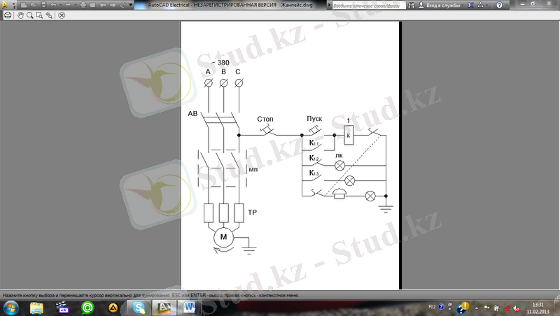 А, В, С үш фаза берілген, сол үш фазаға айнымалы 380В кернеу беріледі. Автоматты ажыратқыш қосылады, сол кезде К1. 2 контактісі арқылы қосылған қызыл шам (ЛК және СЕТЬ) жанады, ол жүйеге кернеу келіп тұр дегенді білдіреді.