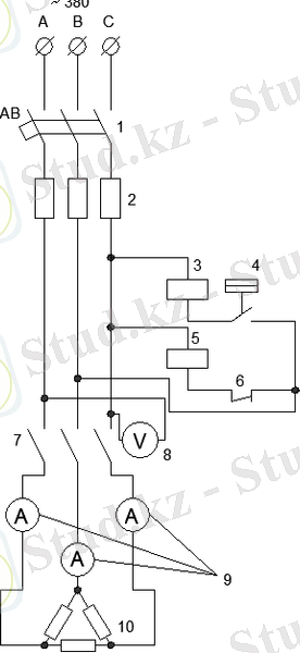 А, В, С үш фаза берілген. Сол фазаларға айнымалы 380В кернеу берілді. Автоматты ажыратқышты (1) қосқанда жүйеде тоқ жүреді. Термосигнализатордың (4) контактісін қосқан кезде, магнитті қосқыштың контактілері (7) қосылып, магнитті қосқыштағы (5) катушка іске қосылады(подхват жасайды) . Сол кезде электр жетегі іске қосылады. Бұл жерде тоқ күшін өлшеу үшін Амперметр (9) және кернеуді өлшеу үшін Вольтметр (8) қолданылады. Сонымен қатар апаттық жағдайларды болдырмас үшін қауіпсіздік элементтері де бар. Олар сақтандырғыштар (2) және аралық релелер (3) . Сақтандырғыштар (2) шамадан тыс кернеу көбейіп кеткен кезде қорғайды. Аралық реле контактілері (6) белгілі бір уақыт аралығында қосылып, ажыратылып отырады. Себебі қыздыру элементінің (10) жұмыс жасауы осы аралық релелерге (3) байланысты. Қыздыру элементі (10) апаттық жағдайға ұшыратпас үшін және суды белгілі бір мөлшерде қыздырып, температураны реттеп отыру үшін қолданылады.