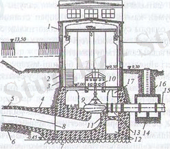 Сорап стансасының көлденең қимасы: 1 - станса ғимараты; 2 - темірбетон қабырға; 3 - кірпіш қаптама; 4 - жамылғы; 5 - сутартқыш; 6 - бетон төсеніші; 7 - тығыздалған әктас; 8 - су жібермейтін жапсар; 9 - сорап агрегаты; 10 - электр қозғалтқыш; 11 - косымша құбырлар; 12 - ішкі қуыс; 13 - ысырма; 14 - су өлшегіш; 15 - тегеурінді құбыр; 16 - бақылау құдығы; 17 - кабелъ каналы.