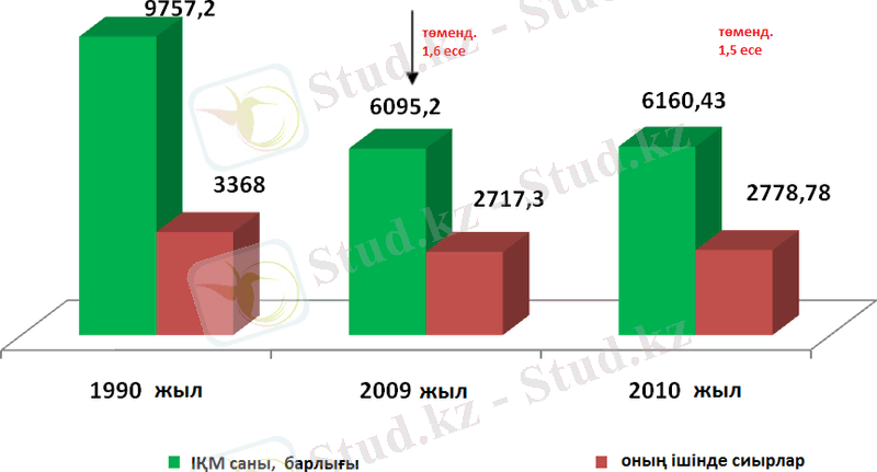 Қазақстан республикасының шаруашылықтарының барлық дәрежелерiне iрi қара мал саны (бұдан әрі ІҚМ) 1990 жылдан 2010 жылға дейiн 9757, 2 мың бастардан ( олардың ішінде сиырлар 3368 мың бастардан 2778, 78 мың бастарға дейiн) 6 160, 4 мың бастарға дейiн төмендедi. (сурет 1)