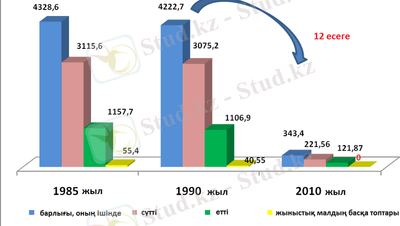 1990 жылдың ұқсас кезеңдерімен салыстыруындағы 2010 жылдың 1 қаңтарындағы күйi бойынша шаруашылықтардың барлық дәрежелерiндегi асыл тұқымды ІҚМ басының саны 12 есе азайған; сүт жыныстарының мал басының саны 13 есе; ет жыныстарының мал басының саны 9, 1 есе. (сурет 2) . Республикадағы ІҚМ бас санының төмендетуiне колхоздар, совхоздардың, шаруашылықтың жаңа формалары, қайта ұйымдастырылуы ықпал тигiзеді.