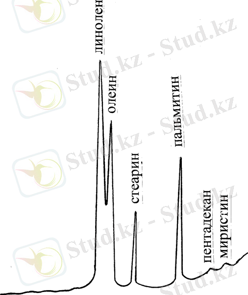 Өсімдік шикізатында май қышқылдарының болуы өсімдіктегі липидтердің гидролизіне байланысты. Май қышқылдарының глициридтері физиологиялық белсенді болып табылады. Бұл қышқылдар ағза тіршілігі үшін маңызды роль атқарады. Алынған өсімдіктер шикізатында көп мөлшерде шыны майы болғандықтан май қышқылдық құрамы «CARLO ERBA-4200» газды хроматограф аппаратында анықталды. Зерттеу нәтижелері төмендегі 1-суретте және 3-кестеде берілді.