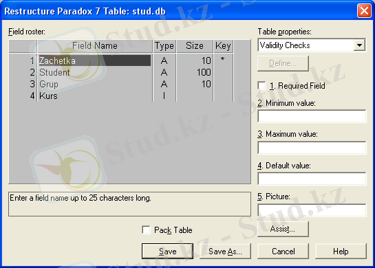 4 - сурет. stud. db кестесін құрастыру терезесі.
