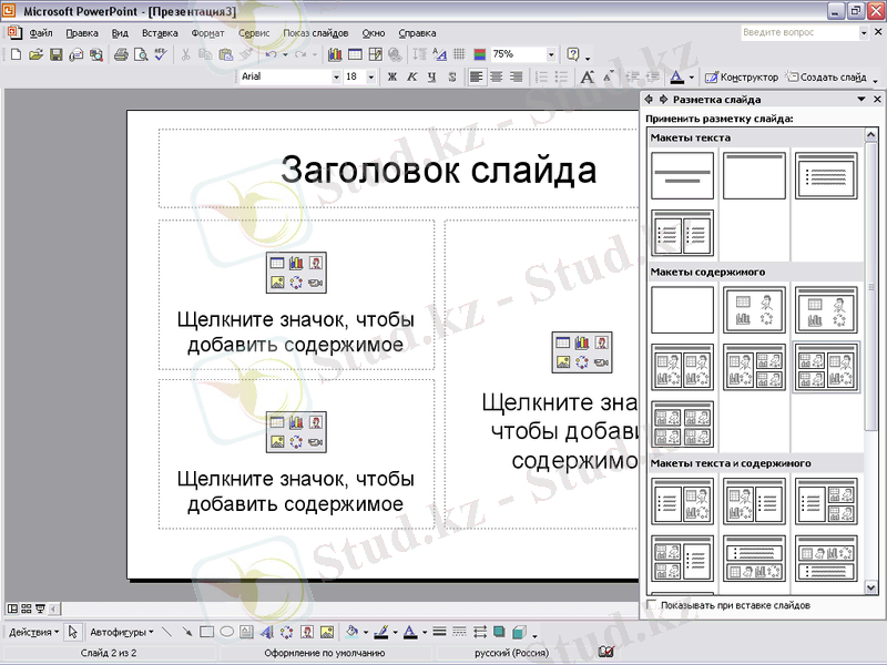 - Слайд белгіленуі(Разметка слайда) . Слайд белгіленуі ретінде слайдқа орналастыратын мәтін, сурет, диаграмма т. б. формасын айтуға болады.