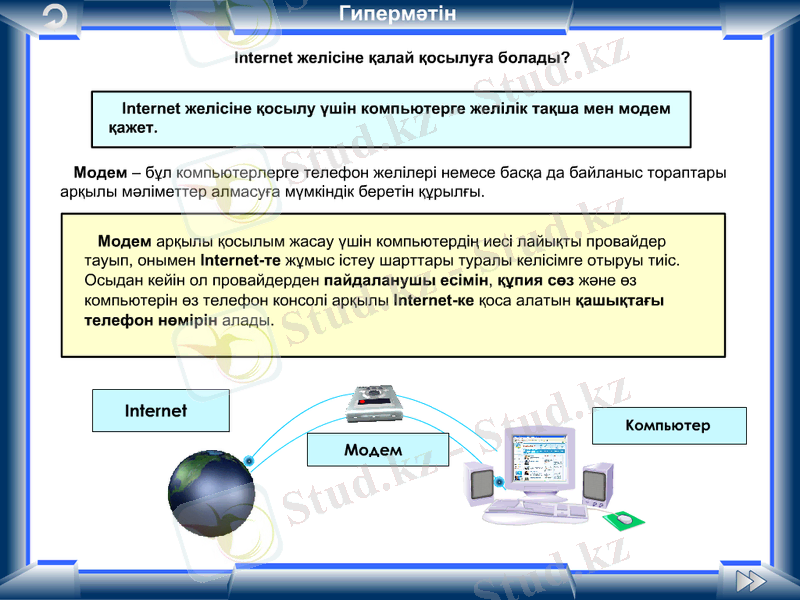 Интернет желісіне қосылу үшін компьютерге модем керек. Модем дегеніміз - бұл компьютерге телефон желісі және сымдары арқылы мәлімет алмасуға мүмкіндік беретін құрылғы. Модем арқылы қосылым жасау үшін компьютерге иесіне лайықты эпровайдер тауып Интернетте жұмыс істеуге келісімге отыруға болады.