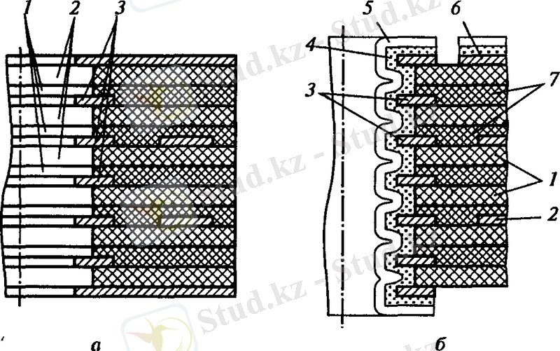 КҚБП-ның саңылауларының қиылысуы: а - металлдау алдындағы диэлектрикпен улау; б - диэлектрикпен улаудан кейін; (1 - КҚБП-ның ішкі қабаты, 2 - ішкі қабаттың өткізгіші, 3 - ішкі қабаттың контактілік алаңы, 4 - химико-гальваникалық мыс қабаты, 5 - металл кескіш қабаты, 6 - сыртқы қабат өткізгіші, 7 - тірегіш ) .