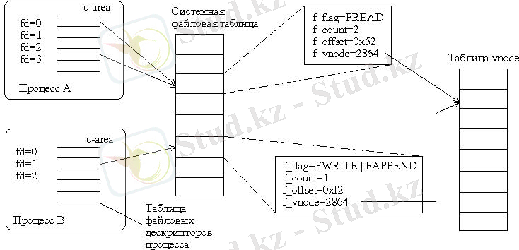 Сурет №2-де жүйелік файлдық кестенің бірнеше жазбалары сол файды адрестейді. Ол vnode кестесіндегі жалғыз жазбасы берілген.