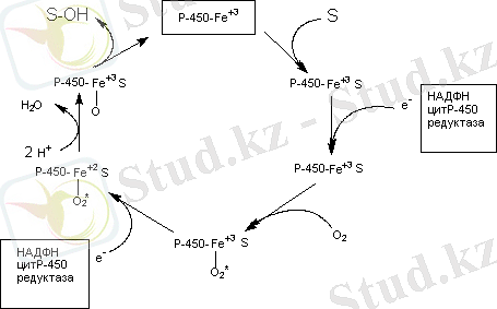 Суретте көрсетілгендей, ксенобиотик (S) цитохром Р-450 ферментінің тотыққан формасымен қарым-қатынасқа түседі, сосын бұл комплекске НАДФН-қа тәуелді цитохром Р-450 редуктаза көмегімен электронды қосып алады. Тотықсызданған НАДФН донор болып табылады. Осыдан кейін бұл комплекс оттегімен әрекеттесіп, екінші электронды (донор-НАДФН) байланыстырады. Әрі қарай оттегімен байланысқан цитохром активтеніп, протондарды байланыстыру және суды бөлу қабілетіне ие болады. Осы кезде түзілген цитохром Р-450 фермент формасы, субстратты гидролиздейді. Метаболизмге қатысатын зат, цитохромның белоктық бөлігімен байланысады. Ксенобиотик зат айналымға түскенде СО-не өте сезімтал болып келеді, өйткені СО-ді цитохром Р-450 ферментінің құрамындағы геминді топпен темір арасындағы байланыстан оттегіні ығыстырып шығарады. Р-450 гемпротеин тобына жататындықтан, оның активтілігі тікелей гемнің синтез процесімен байланысты немесе темірдің зат алмасуымен байланысты. Р-450 ферментінің активтілігінің төмендеуі мынаған байланысты: