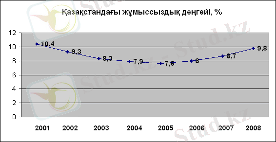 Келесі кестеде елiмiздегi жұмыссыздық деңгейiнiң өсуiнiң және 2000 жылдан бастап 2008 жыл аралығындағы жұмыссыздық деңгейiн төмендегi графиктен көре аламыз.