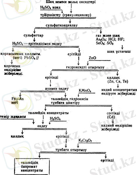 Байытылған шикізаттарда таллийдiң мөлшері 0, 01-0, 1%-ке дейiн болады. Оны күкiрт қышқылының судағы ерiтiндiсiмен өңдеп ерiтiндiге өткiзедi. Шаңның құрамына байланысты оны алдын-ала күйдiредi немесе сульфатизациялап, содаң кейiн ерiтiндiмен өңдейдi. Ерiтiндiдегi таллийдiң мөлшерiне байланысты оның концентратын алу үшін мынадай тәсілдер қолданылады: таллийдің гидрокисін Т1(ОН) 3 , сульфидін Т1 2 S, хлоридін ТІСІ, хроматын Т1СгО 4 ; Т1 2 Сг 2 О 7 тұнбаға шөктіру; экстракциялау, цементациялау және сорбциялау. Мысалы бихромат таллийдің тұнбаға отырғызу технологиясын алайық. Оның технологиялық схемасы 1-суретте көрсетілген. Бұл тәсілді ерітіндідегі таллийдің мелшері 5 г/дм 3 -ден жоғары болғанда қолданылады. Тәсілдің тиімділігіне таллийді басқа қоспалардан (Zn; Cu; Cd; Fe) бөліп тұнбаға отырғызады. Ол үшін 5-10 г/дм 3 күкірт қышқылының ерітіндісіне қаныққан натрий бихроматын қосады. Қалдықтағы 20-30% таллий бихроматын күкірт қышқылында мынадай тотықсыздырғыштарды (Zn; Na 2 SO 4 ; H 2 S) қосып ерітіп, алты валентті хромды үш валентке өткізеді. Содан кейін сульфатты ерітіндіден таллийді мырышпен цементациялау арқылы бөледі. Біздің елде таллийді ерітінділерден бөліп алуды тездету үшін экстракция тәсілі қолданылады. Күкірт қышқылының ерітіндісінен таллийді бөліп алуға ҮБФ-тың керосиндегі ерітіндісін қолдануға болады. Ерітіндіде таллийдің йодиді түзіледі де ол ҮБФ-пен мынадай комплекс түзеді.