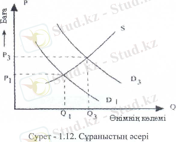 Егерде нарықтық бағасы теңдестік бағасынан төмен болса, онда сұранысы жоғарылайды, және көп өндірудің арқасында көп ала бастайды. Бұл жағдайда, сұраныс пен ұсыныс теңдестік өыдірушілері мен тұтынушыларының келісіміне келгенше, сұраныстың қисығы бойынша жоғарыға ығысуы жүріп отырады және бағаның жоғарылауын болдыратын, «сұраныстың артуы» пайда болады (сурет - 1. 9. ) .
