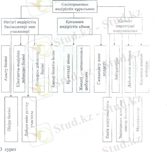 Өндірістік тармақтары (цехтар, бөлімдер, қоймалар, зертханалар, шеберханалар т. б болып табылады), бұлардың сонымен құрамы кәсіпорынның өндірістік құрылымын анықтайды. барлық өндірістік тармақтар (цехтар, бөлімдер) қызмет көрсететін шаруашылық, өндірістік үрдісіне тікелей және жанама қатысын қызметтердің барлығы серіктестіктің өндірістік құрылымы.
