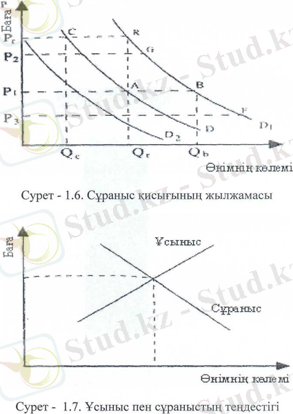 Сурет - 1. 6. -дан көрініп тұр, Б қисығының ығысу түсінігі Б қисығы бойынша Б қозғалысы көрсетілген. Мысалыға, "сұраныстың жоғарылау әсерімен тауарға баға өсімі жүреді" - бұл бағаның әрбіреуіндегі В тауарға табыстың өсу өзгерісін, Q қисығының оңға ығысуы (Р1 қисығы) және өнімнің а саны кейіннен Р1 бағасы бойынша алынғанын білдіреді, ал енді бағаның нақты өсімінің жүруі кезінде Р1 бағасы бойынша алынады. Еғерде барлық факторлары өзгеріссіз қалса, әрбір Р1г-ге дейін тауардың бағасы өсті, нәтижесінде Б шамасына дейін азайса, онда А нүктесінен С нүктесіне сұраныс қисығының орынауысуының жүретін сұранысын көрсететін, тауарлар саны төмендеді. Нарықтық экономикадағы негізгі микроэкономиканың көрсеткіштерімен ендірілетін өнімнің көлемі мен бағасы болып табылады. Тауардың бағасын орнатудың механизмі сұраныс пен ұсыныстың әсерімен қалыптасады. Сұраныс пен ұсыныстың категориясы микро- және макро- деңгейінде маңызды экономикалық мағынасы бар. Сұраныс пен ұсыныстың механизмі тек қана бағаның пайда болу механизмін ғана нақтыламайды, сонымен қатар, нарықтық қатынастың қызметтелуі.