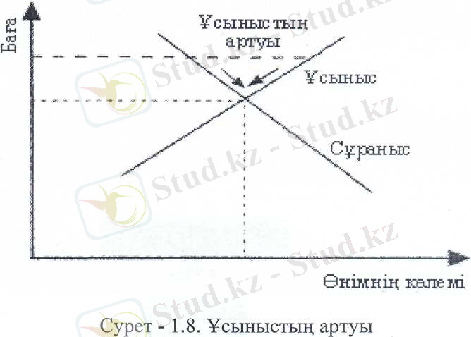 Өнімді өндірушілер жағынан ұсынысы бірнеше факторларымен анықталады: өндірістің шығындары, бағасы, мақсаты - максималдық пайданы алуы немесе бағаның төмендеуі арқылы қосымша нарықтарын алу. Кәсіпорын құрылғының анықталынған бөлігін қысқарту кезінде өндірістің көлемін жоғарылату үшін жұмысшылар санын жоғарылату арқылы өндірістің өсімін кеңейтеді. Бұл бағаның жоғарылауына әкеледі. Өндіріс көлемінің жоғарылауы бағаны жоғарылату жолымен болуы мүмкін. Бұл жағдайда, ұсыныстың қисығы солдан оңға қарай жоғары өзгереді. Осы қисықтың формасы өндірістің технологиясы мен өнімнің түрінен қатысты. Осындай форманың өзгерісі қаншалықты баға жоғары болса, соншалықты өндіріске және өнімнің сатылуына кірісетін кәсіпорындар саны көи болатындығын білдіреді. Өте жоғарғы бағасы пайдалылығы жоқ өнімнің бағасының төмен болуы кезіндегі және өндіріс шығындарының жоғары болуындағы, жаңа кәсіпорындар нарығына тартуы мен жаңа жұмыс күштерін тарту жолымен қысқа уақыт аралығындағы өндіріс көлемін кеңейтуге стимулдайды (сурет - 1. 1. ) .