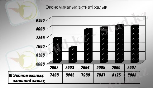 Экономикалық активтi халықтың өсу динамикасын келесi 3-шi суреттен көруге болады. Биылғы 2007 жылы экономикалық активтi халық 8, 08 млн. адамға жеттi, өткен жылмен салыстырғанда шамалы ғана төмен, солардың iшiнде жұмыспен қамтылғандары 7, 3 млн. адам. /5/