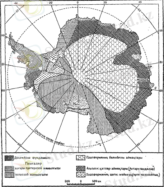 Антарктида ― Жер шарының оңтүстік полярлық аймағындағы құрлық. Жерінің аумағы 12, 3млн. км 2 , ал кайраңдық мұздықтар мен аралдарды қосқанда 14, 0млн. км-ге жетеді. Жерінің 99%-ын қалың мұз басып жатыр. Оның жалпы көлемі 26млн. км 3 . Антарктида - дүние жүзіндегі ең мұзды кұрлық. Оның мұз жамылғысымен қоса есептегендегі орташа биіктігі 2040м, яғни барлық құрлықтардың орташа биіктігінен (870м) 3 есе артық. Құрлықтың жағалық сызығы онша тілімденбеген, оның құрамына бір ғана үлкен түбек -Антарктида түбегі мен бірнеше іргелес аралдар - Александр 1 жері, оңтүстік Шетланд, Георгия және Оркней, Беллени кіреді. Құрлықтың жағалауын Оңтүстік мұхит сулары мен Уэдделл, Белинсгаузен, Амундсен, Росс, Ғарышкерлер т. б. теңіздер шайып жатыр. Антарктида құрлығының негізгі абсолюттік жасы 1, 6 млрд. жыл болатын гондваналық платформа түзеді, басым бөлігі архей эрасындағы гнейс, кристалды жақпар тас, граниттерден құралған. Жыныстардың іргетастарының қалыңдығы 20 км-ге жетеді. Антарктида платформасы өзінің геологиялық құрылымы мен жыныстарының құрамы жағынан Бразилия, Аустралия, Экваторлық және оңтүстік Африка, Үндістан платформаларына өте ұқсас. Ол төменгі және жоғарғы полеозойлық құрылымдары есебінен көлемі ұлғайып, батыстағы Антарктида түбегін алып жатқан мезо-кайназойлық Анд қатпарлы жүйесінің жалғасы болып табылатын жас қатпарлы құрылымдарға ұласады. Олардың іргетасының өте күшті өзгеріске ұшыраған құрлықтың шөгінді жыныстардан құралғандығы, осы аймақта жер қыртысының құрлықтық типінің дамығандығына дәлел болады. Ондағы жер қыртысының орташа қалыңдығы 40 км. Антарктиданың қазіргі жер бедерінің қалыптасуы жаңа жанартаулық атқылаулар нәтижесінде жүруде (1-сурет) . Антарктиданың тектоникалық картаcынан көруге болады.