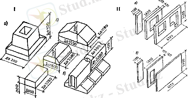 Азаматтық үйлер құрьлысына арналғап темірбетон бұйымдары. Ірге тастар үшін іргетастық блоктарды қадаларды пайдаланады. Қабырғалар астына текше (ленталық) іргетастарын трапеция түріндегі (іргетас ені 0, 6-8 см) жеке блоктардан орындайды. Сурет 16. 1 келтірілгендей, блоктар ұзындығы 0, 78 - 2, 38 м, биіктігі З0-50 см, массасы 0, 5-4т, блоктарды М150 - М300 ауыр бетондардан жасайды. Жертөле қабырғаларын М100 - М150 ауыр бетондардан жасалынған бүтін немесе қуысты блоктардан орындайды, олардың ұзындығы 2. 5 м, биіктігі 70 см, ені 50 см дейін құрыш торларымен арматураланған болады. Блоктардың көлденең бүірлерінен тік ойықтар қалдырады. Бұларын блоктарды тиісті жеріне орналастырғаннан соң, ерітіндімен немесе бетонмен толтыра конструкцияны біртұтастайды.