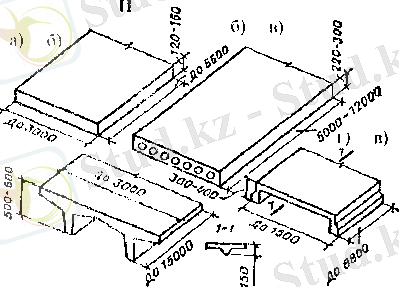 Сурет 16. 2. керсетілгендей, тұрғын және. қоғамдық үйлер жабындықтары тұтас қимадағы, қуыс денелі, қабырғалы плиталардан болулары мүмкін. Көпқуысты плиталар цилиндірлік қуыстарымен ұзындығын 6 м, енін 2, 4 м және қалыңдығын 22 см немесе ұзындығын 9-12 м, енін 1, 5 м және қалыңдығын 30 см параметрінде жасалынуы мүмкін. Қабырғалы плиталарды П - тәріздегі қимасында ұзындығын 8. 8 м. енін 1. 5 м биіктігін 40 см етіп жасайды.