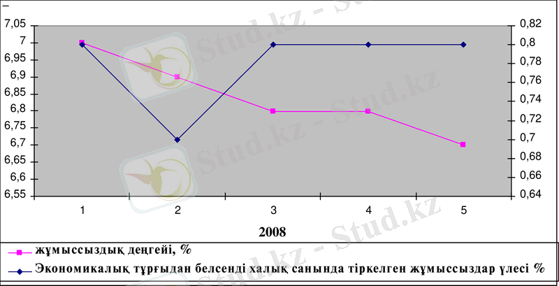 2008 жылғы қаңтар айындағы жұмыссыздық деңгейі - 7, экономикалық тұрғыдан белсенді халық санында тіркелген жұмыссыздар үлесі %-бен 0, 8; ақпан айында жұмыссыздық деңгейі-6, 9, жұмыссыздар үлесі 0, 7; наурыз-сәуір айларында жұмыссыздық деңгейі - 6, 8, жұмыссыздар үлесі - 0, 8; мамр айындағы жұмыссыздық деңгейі - 6, 7, үлесі - 0, 8.