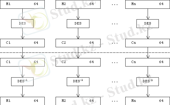 Бұл режимде бастапқы М файлы 64-битті блокқа (8 биттен) бөлінеді: M = M(1) M(2) . . . M(n) . Осы блоктың әр қайсысы шифрлеу үшін бір кілті қайта қолдануына тәуелсіз кодталады (сурет 5) . Осы алгоритмнің ең негізгі артықшылығы - жүзеге асырудың қарапайымдылығы. Кемшілігі - білікті криптоаналитиктерге қарсы әлсіз тұрақтылығы.