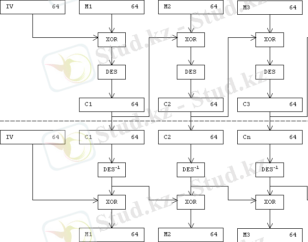 Бұл режимде бастапқы М файлы ECB режимі секілді 64-битті блокқа бөлінеді: M = M(1) M(2) . . . M(n) . Бірінші блок M(1) күн сайын ауыстырылатын және құпияда сақталатын 64-битті бастапқы IV векторының 2 модуліне тіркестіріледі. Содан кейін алынған сумманы жіберушіге де, ақпаратты қабылдаушыға да анық DES кілтін пайдалана отырып шифрлейді. Анықталған 64-битті C(1) шифрмәтіндік блок 2 модулді бастапқы мәтіннің екінші блогымен біріктіріліп, нәтижесін шифрленеді де екінші 64-битті C(2) шифрмәтін блогы алынады және т. б. Процедура барлық блоктың бастапқы мәтінін өңделгенге дейін қайталана береді (сурет 6) .