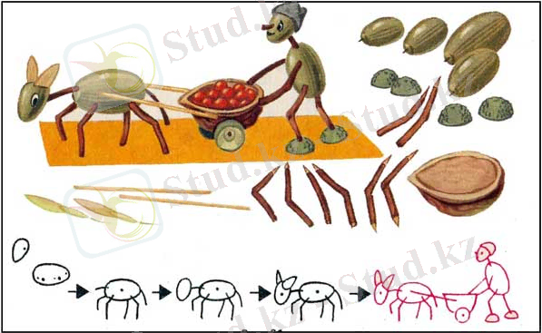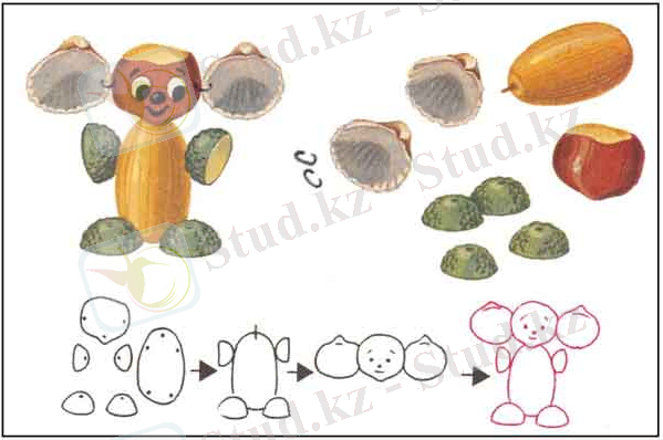 Екінші кезең - бөліктердің жекелеген бөлшектерін біріктіру. Бала назарын табиғи материалдың сапасы мен беріктігіне аудару.