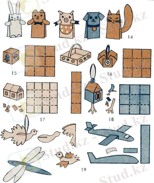 Балаларды қағазды әр бағытта бүктеуге, әр түлі қағаздарды пайдалануға, шаблонның көмегімен белгілер салуға, қызықты ойыншықтар жасауға үйрету.