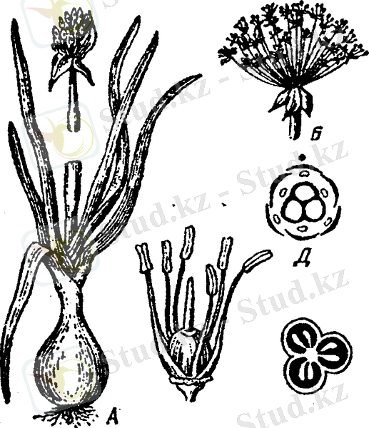 Жуа туысы (лук -Аllium) . Дүниежүзі бойынша 400-дей түрі бар, оның 250 БОР-дың территориясында, ал Қазақстанда 109 түрі кездеседі. Баданалы және тамырсабқты өсімдік. Екі түрлі жапырағы болады - трубка тәрізді және жалпақ жапырағы. Гүлінің формуласы: * Р 3+3 А 3+3 G (3) . Гүлшоғыры шатыр түзеді, дамудың алғашқы кездерінде жамылғысы (гүласты жапырақшасы) болады. Кейде гүлшоғырында ұ С ақ баданалары - өнім бүршіктері пайда болады. Жемісі қорапша (қауашақ) . Пияз, катпарлы жуаның (лук репчатый - А. сера) (244-сурет) жапырағы трубка тәрізді, басында гүлі болатын, сабағының іші қуыс, үрленген болып келеді, гүлшоғыры шар тәрізді. Пияздың ащы иісінің болуы оның құрамында эфир майының барлығын көрсетеді (концентрациясы 0, 03-0, 05%), одан басқа пияздың құрамында (5% дейін), витаминдер В. С., фитонцидтер болады. Жабайы түрі белгісіз; көптеген сорттары шығарылған. Сарымсақ (чеснок - А. sаtіvum) - жапырағы жалпақ, түзу, жамылғысының ұзын тұмсығы болады, баданасы көптеген ұсақ пиязшықтан (деток) тұрады. Пиязшықтары арқылы және өнім бүршіктері арқылы көбейеді, құрамында сарымсақ майы болады, кеңінен отырғызылады. Порей жуасы (лук порей-А. роrrum) жапырақтарымен сабақтарының жеуге келетін түп жағы үшін отырғызады. Домалақ пияз (лук круглый - А. rоtundum) көп жағдайда күресуге бой бермейтін арамшөп ретінде өседі.