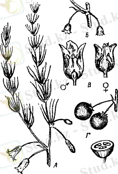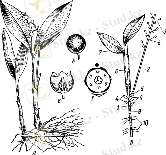 А-жалпы көрнiсі; Б-құрылысының сызба-нұсқасы (тікесінен жасалған кесіндісі) ; Г-гүлінің диаграммасы; Д-жемісі жидек: 1-негізгі өс (барлық уақытта вегетативті) ; 2-екінші қатардағы өс (репредуктивті өркен) ; 3-үшінші қатардағы өс, гүлмен аяқталады (гүлсағағы) ; 4-төменгі қабыршақты жапырақтар; 5-бүйірлік өркеннің түбінен кететін жапырақ (предлист) ; 6-жасыл жапырақтарының жабық қынапшасы (7), жалған сабақ түзеді; 8-гүласты жапырақша (3-қатардағы өсті жауып тұратын жапырақ) ; 9-тамырсабақ; 10-қосалқы тамырлары.